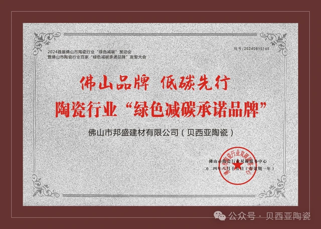 佛山品牌 ● 低碳先行 I 貝西亞陶瓷榮獲【綠色減碳承諾品牌】稱號